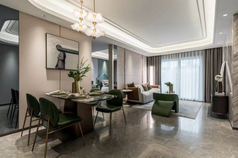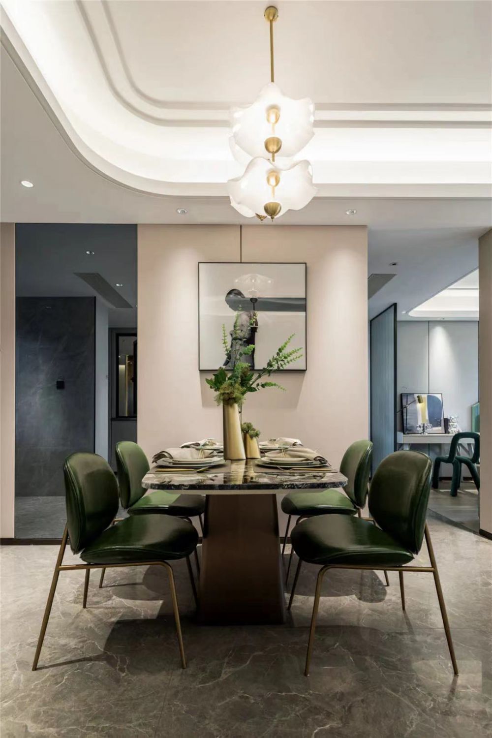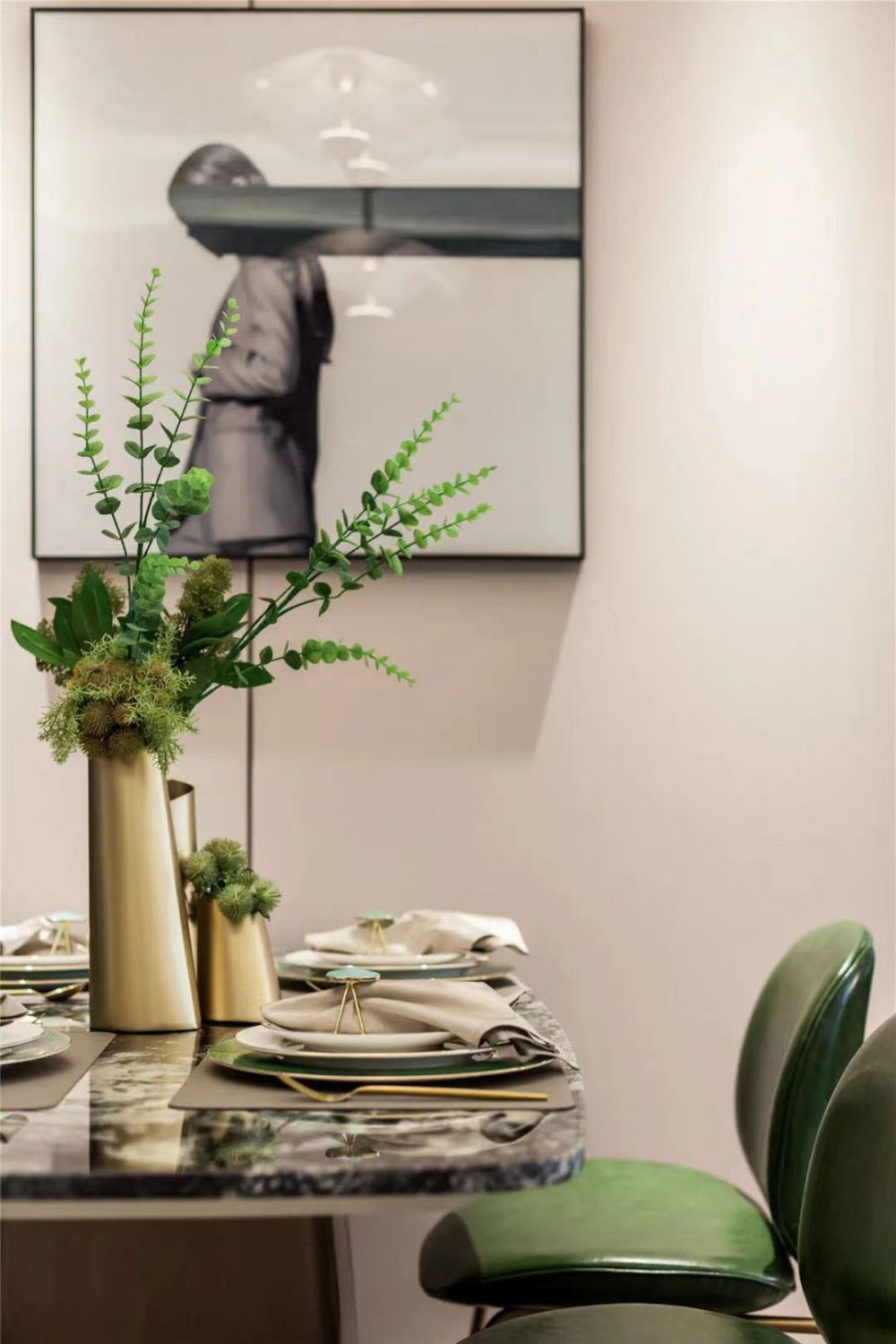 餐廳在素雅的白色基礎上,輔之古銅金屬、鮮亮綠植,沉穩(wěn)復古的綠色皮椅,對應流線型大理石桌,凸顯空間的高雅趣味,更加映襯一家人齊坐一堂和樂融融的時刻。