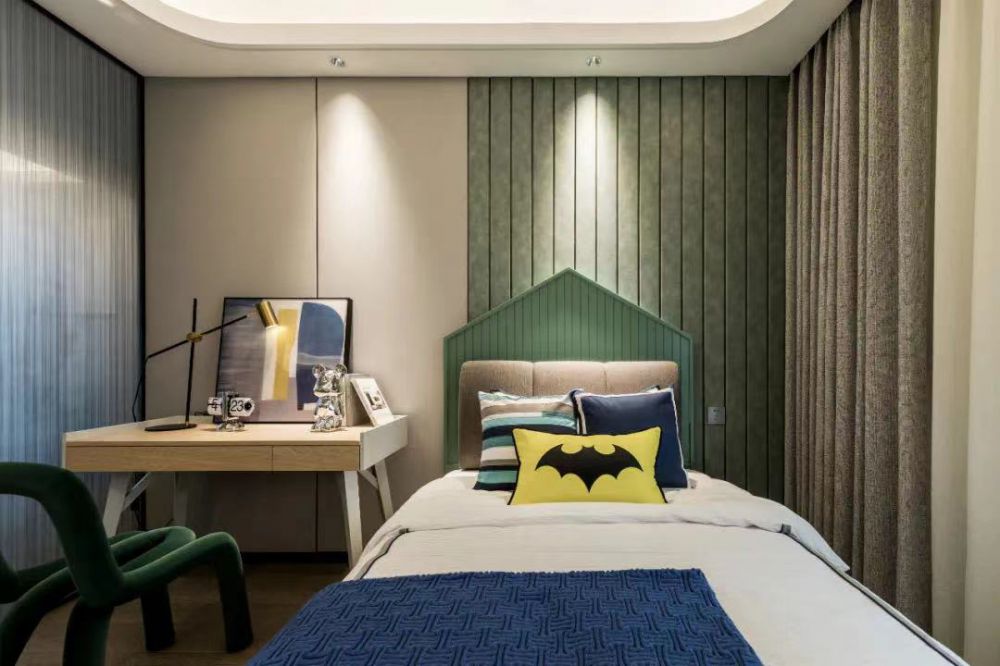 兒童房整體氛圍以暖色系為主,在家具選款上延續(xù)現(xiàn)代線條感,空間明亮溫馨,勾勒出兒童細膩的內(nèi)心。