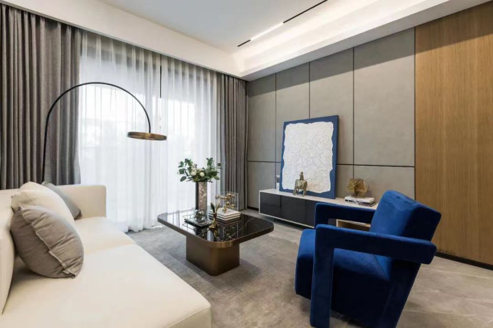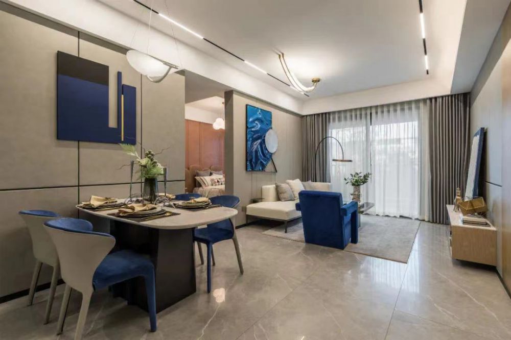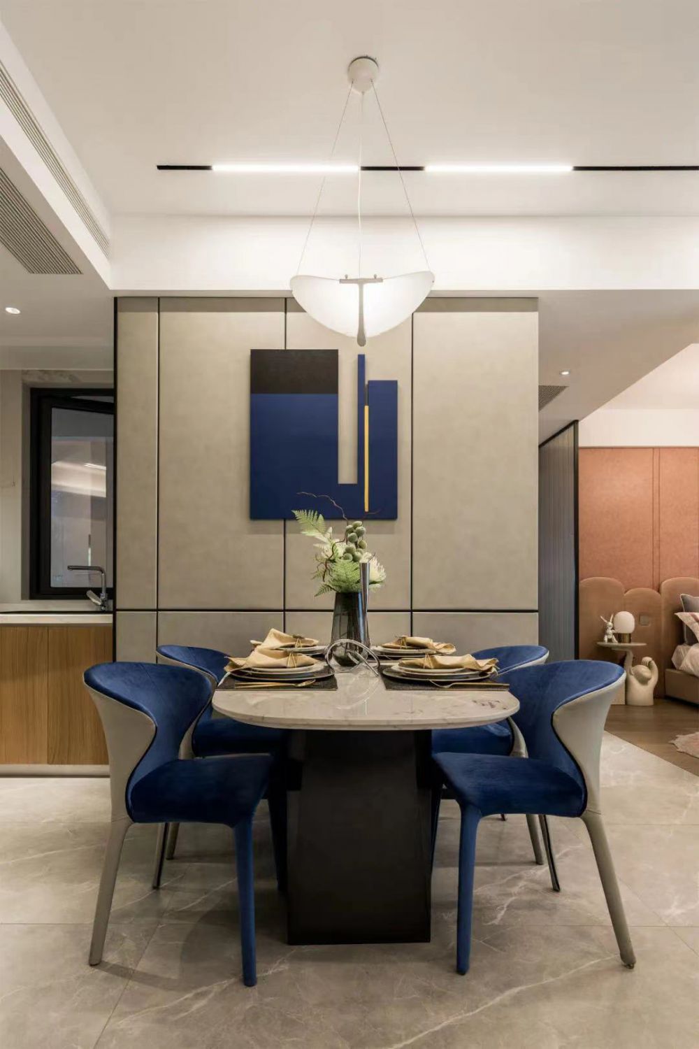 整體空間以藍色為主旋律,通過沙發(fā)、座椅、裝飾畫等軟裝組合不同的藍來相互映襯,層次豐富,墻面采用沉穩(wěn)的灰色,帶來充滿山海意境的生機。
