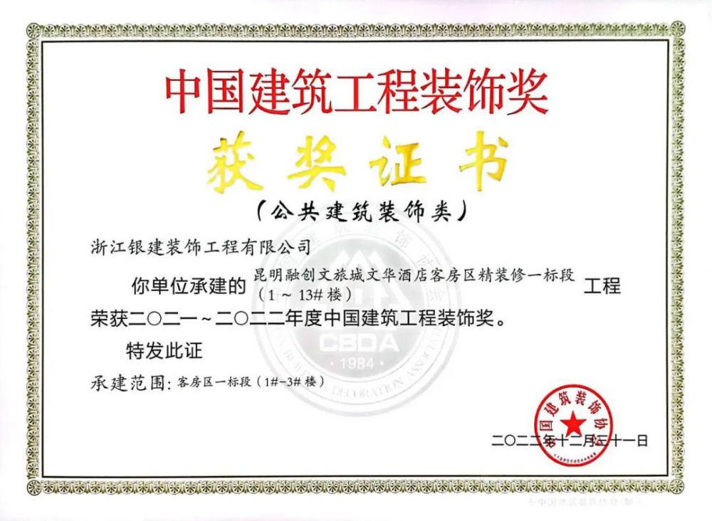 浙江銀建裝飾工程有限公司榮獲2項中國建筑工程裝飾獎