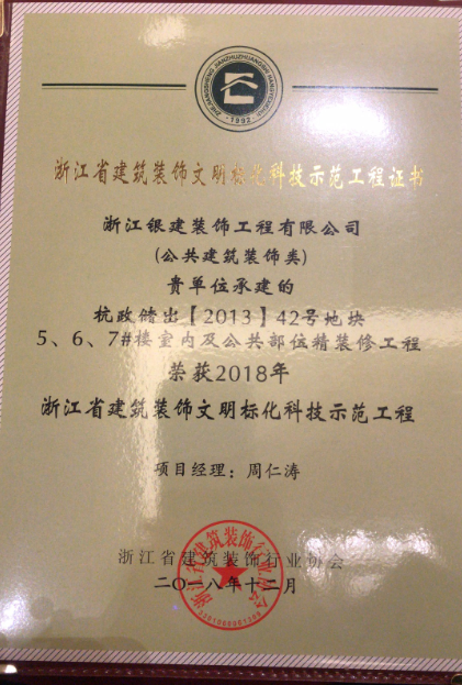 我司承建的杭政儲(chǔ)出【2013】42號(hào)地塊精裝修工程榮獲“2018年浙江省建筑裝飾文明標(biāo)化科技示范工程”。在施工過(guò)程中,項(xiàng)目部全體成員強(qiáng)化科學(xué)管理、精心施工,不斷優(yōu)化施工方案,嚴(yán)守質(zhì)量關(guān),安全規(guī)范等方面均符合國(guó)家要求。